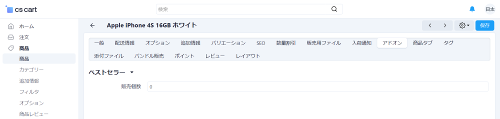 商品詳細の「アドオン」タブからベストセラーの算出に使用する販売個数を手動で調整できます。