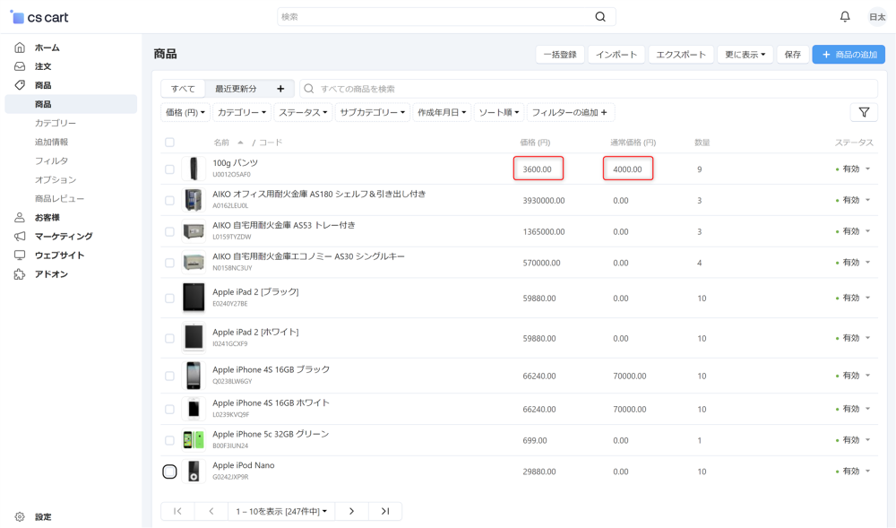 ベストセラーは商品詳細の「アドオン」タブから販売個数を手動で調整できます。セール中商品は商品の価格(セール価格)と通常価格を設定することで、割引率が自動計算され表示されます。