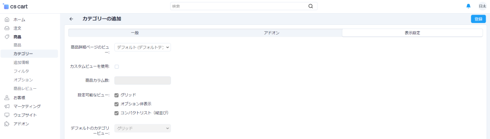 画面右上の「+ カテゴリーの追加」ボタンをクリックするとカテゴリの新規登録画面が開きます。