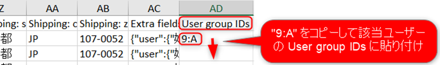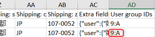 2. エクスポートしたデータを修正します。「User group IDs」のデータを、既存のユーザーでユーザーグループが「クロネコ掛け払い取引先」で有効になっているユーザーのデータと同じ値(例:”9:A”)を、ユーザーグループを「クロネコ掛け払い取引先」にしたいユーザーに変更して保存してください。