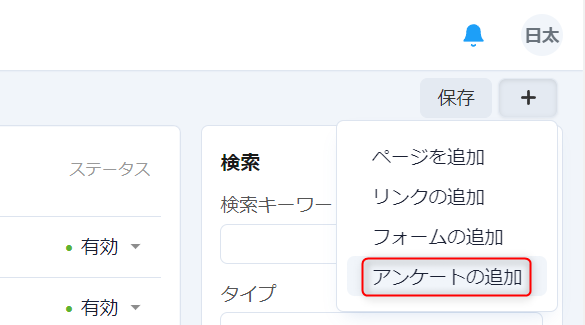 ウェブサイト → ページ の新規追加メニュー(+マークアイコン)をクリックし、「アンケートの追加」を選択します。