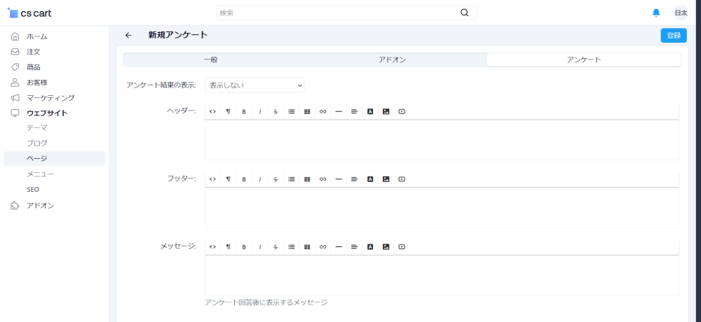 「アンケート」タブではアンケート結果の表示方法の選択、ヘッダーやフッター、アンケート回答後に表示されるメッセージを設定します。