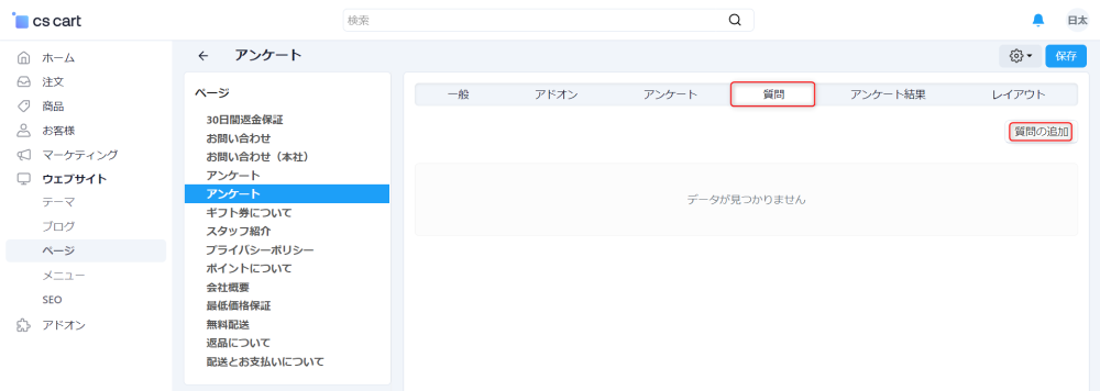 「質問」「アンケート結果」「レイアウト」などのタブが追加されます。