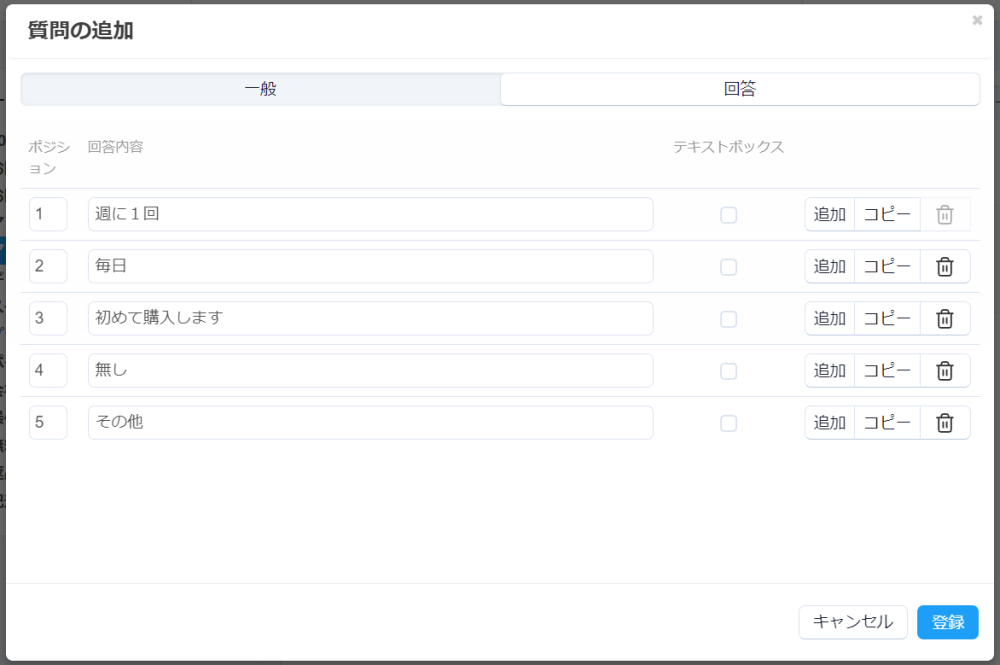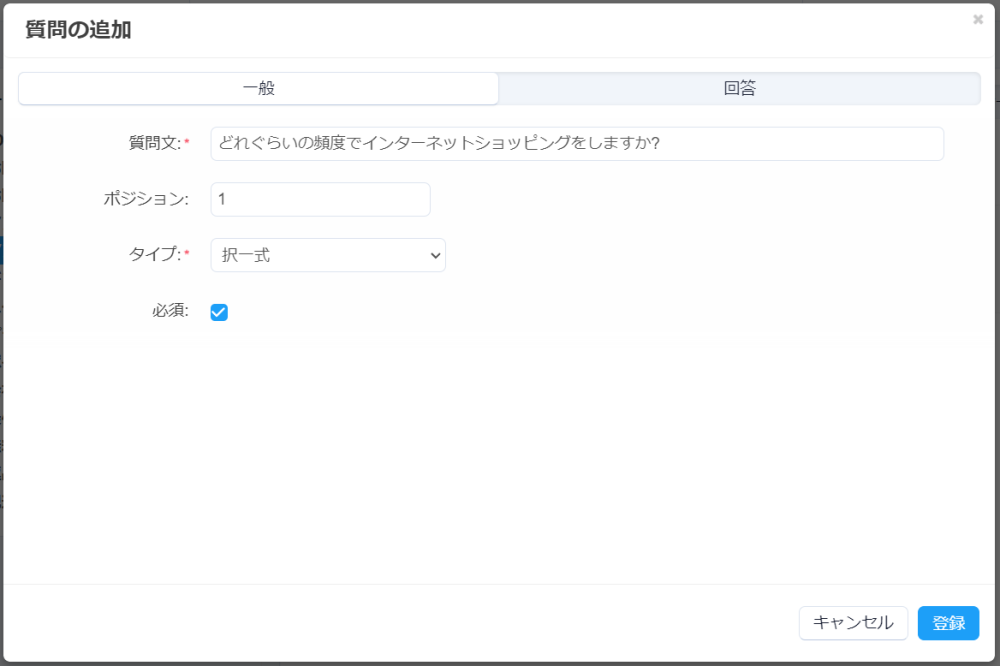 「質問」タブの「質問の追加」ボタンをクリックすると質問する項目を追加できます。