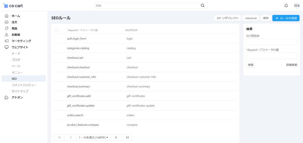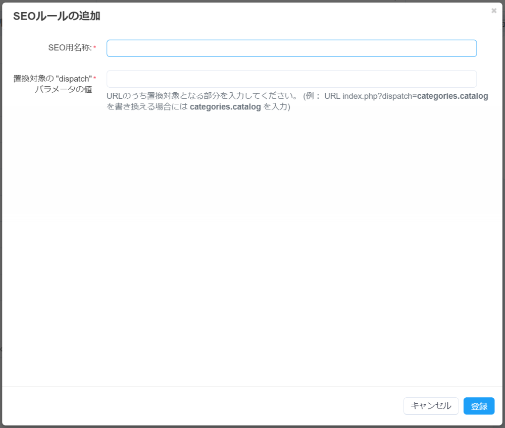 例: URL index.php?dispatch=categories.catalog を書き換える場合には categories.catalog を入力