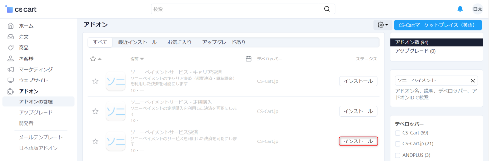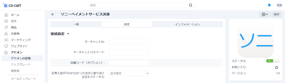 アドオン → アドオンの管理 を表示し、【ソニーペイメントサービス決済】をインストールします。