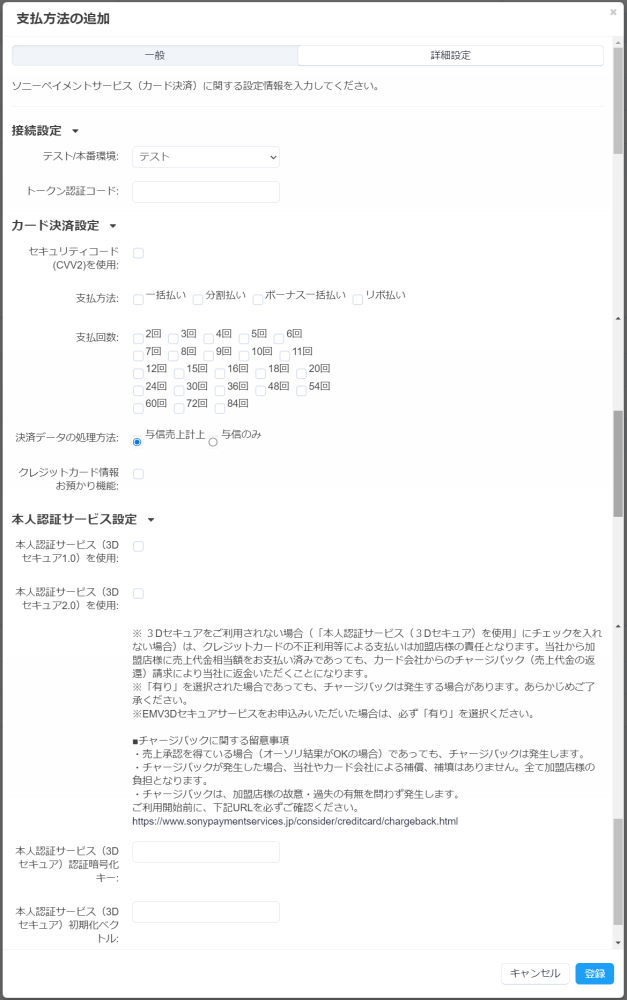 詳細設定 に移動し、トークン認証コード、支払方法、支払回数、本人認証サービス設定等を設定します。