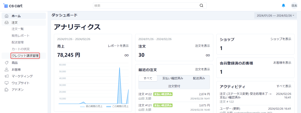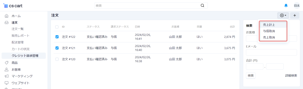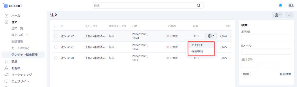 管理画面において 注文 → クレジット請求管理 を選択すると、クレジットカード決済の注文一覧画面が表示されます。