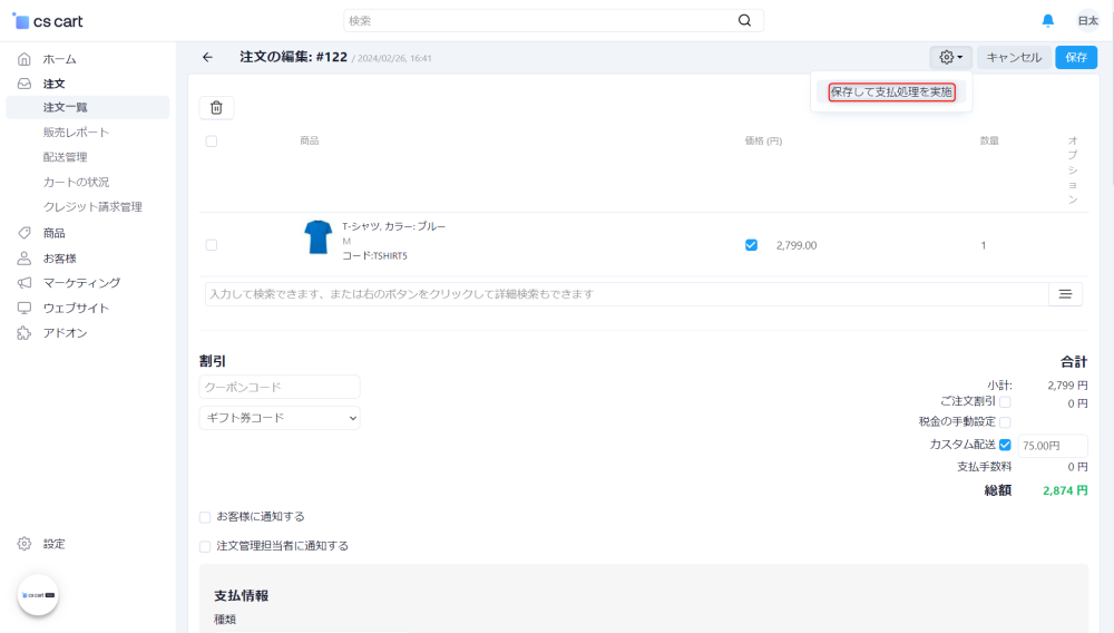 2) 注文内容編集画面で注文の金額を変更後、「合計金額の再計算」をクリックして金額を更新します。