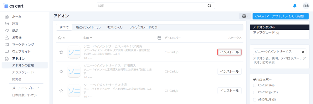 1. CS-Cart管理画面のアドオン → アドオンの管理にある