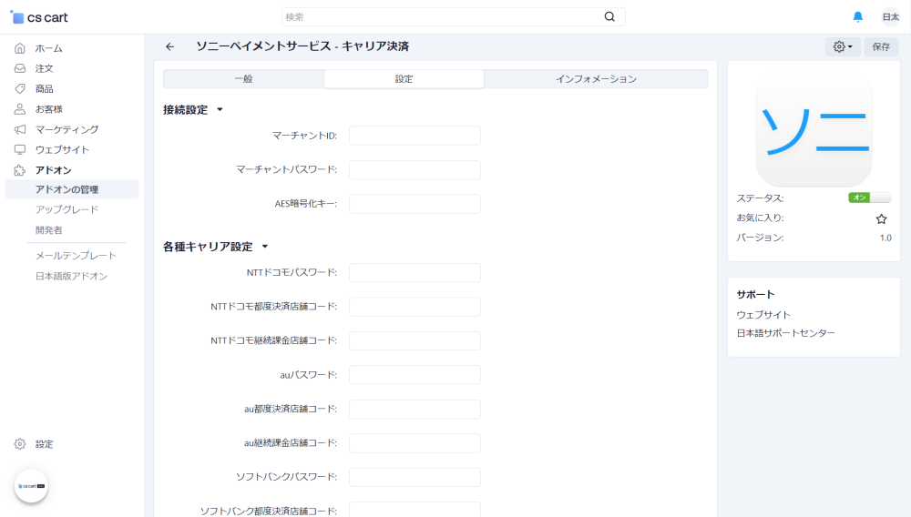 アドオン → アドオンの管理 にアクセスし、 ソニーペイメントサービス – キャリア決済 をインストールします。