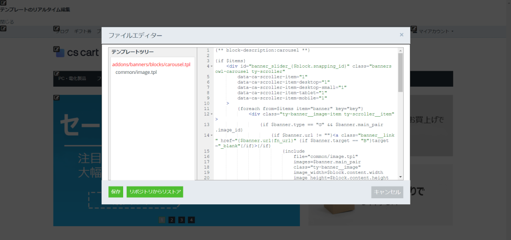 リアルタイム編集モードを起動すると、ショップフロントから目的のテンプレートを編集することができます。