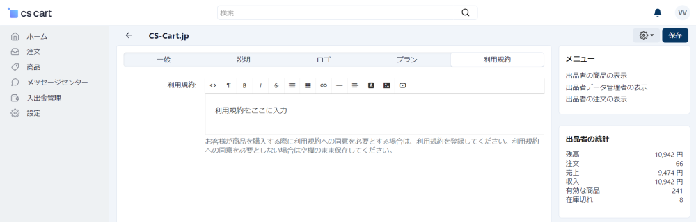 利用規約の設定は種品者の管理画面の右上にある出品者アイコン → 出品者において、「利用規約」タブで行います。