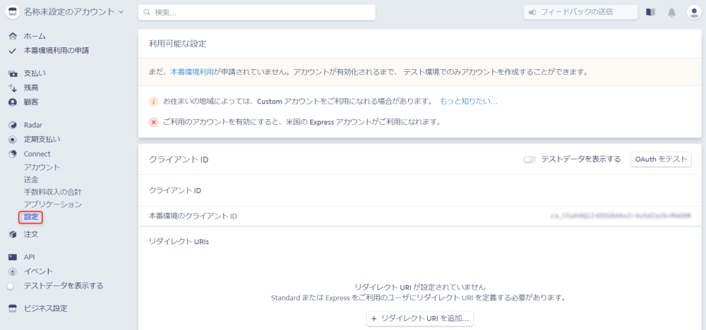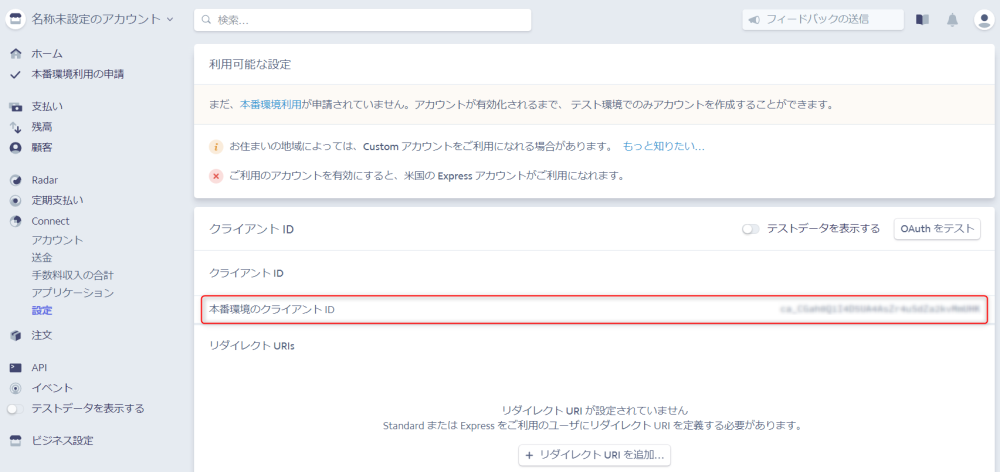 Stripe Connect 決済の支払方法を作成する際に、クライアント ID、公開可能キー、シークレットキーが必要です。また、リダイレクト URIs を Stripe に設定する必要があります。