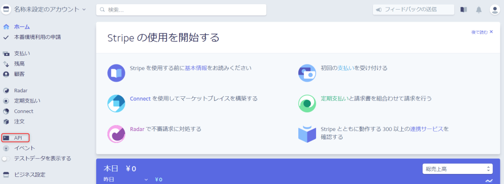 1.Stripe ダッシュボードのサイドバーにある「API」を選択してください。
