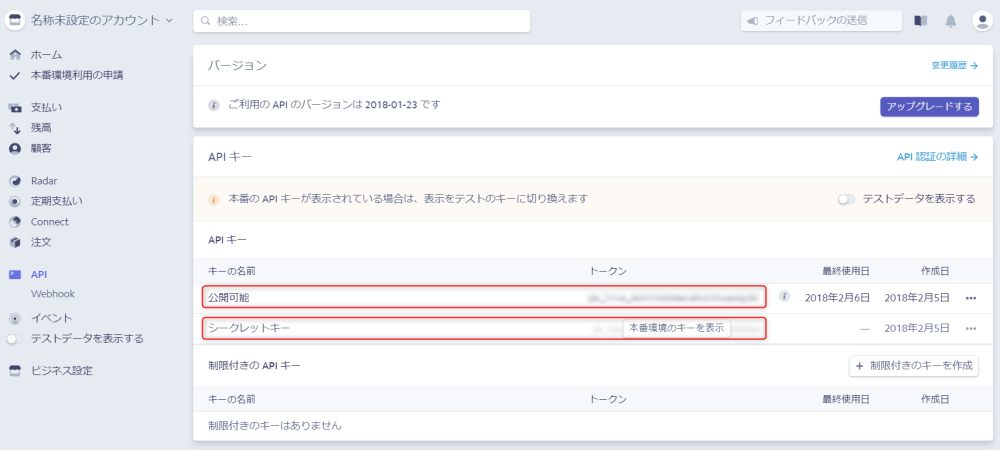 2.APIページで公開可能キー、シークレットキーをそれぞれコピーしてください。
