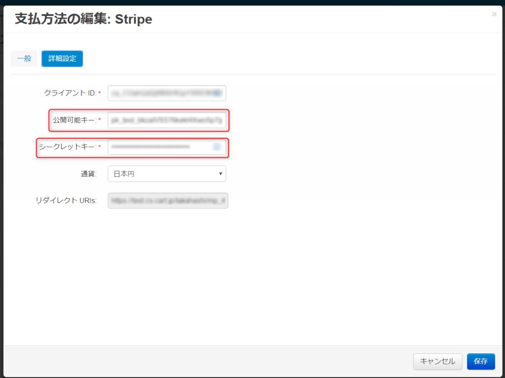 3.コピーした公開可能キー、シークレットキーを CS-Cart上でStripe Connect 決済の支払方法にある詳細設定に貼り付けてください。