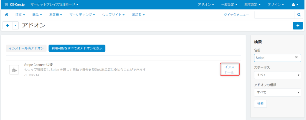 2.「利用可能なすべてのアドオンを表示」タブをクリックして、 Stripe Connect 決済 の右にある「インストール」ボタンをクリックします。